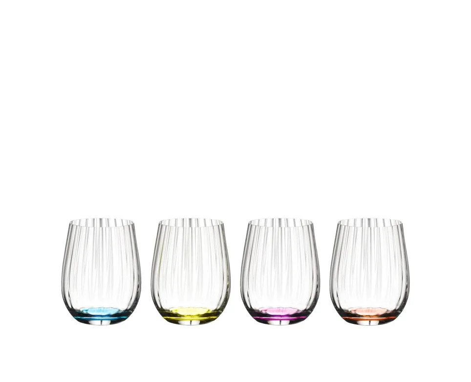 Fire forskellige og flotte Happy "O" Optic glas, i farverne azurblå, violet, rød og orange. I 2003 skabte Riedel deres O Wine Tumbler-serie, der var den første druespecifikke vinglas uden stilk. Disse innovative glas er designet med de smukke former, vi også kender fra Vinum-serien. Med O Wine-serien har Riedel løftet uformelle vinglas til alligevel at give en stor vinoplevelse. På trods af at stilken er fjernet fra disse glas, er der absolut ikke gået på kompromis med kvaliteten. O Wine Tumbler er lavet i det fineste krystal, og maskinblæst for at opnå nøjagtig præcision.